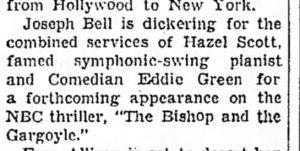 Hazel Scott was a classical pianist, singer and actor. She was married to Adam Clayton Powell, Jr. (I was baptized by Rev. Powell). I wish I could have heard Eddie and Hazel on “The Bishop and the Gargoyle”. Hazel was a music prodigy and was given scholarships to Juilliard School from the age of 8.