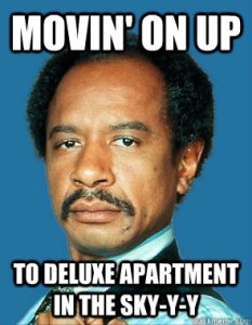 Well, unlike George and Weezy I’ve moved on out of my old too expensive place “in” to a cheaper place. And what a relief it is. I’ve had to go backwards to move forward. Meaning I now have a bit more money to work with and I can be more comfortable while writing my second book and while I wait for my ship to come in. I’m sleeping with less stress as opposed to sleeping because of depression. And now I can focus on The Jeffersons. Getting back into doing research for a book helps balance me out.