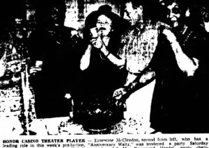 Ernestine McClendon was a Black woman. Born in 1918. I found out that not only had she been in three movies in the 80s and 90s, she had also appeared in the Schlitz Playhouse in 1952! I finally remembered my newspaper account and that’s when I found her picture. (it pays to be diligent) She had a leading role in a play around 1954 titled Anniversary Waltz (she is second from left).